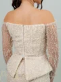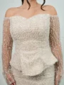 Das Inci Dress in Beige wirkt wie ein Zweiteiler, ist jedoch ein kunstvoll gearbeiteter Einteiler. Perlen und silberne Applikationen zieren das gesamte Kleid, während die schulterfreie Form mit tief angesetzten, langen Ärmeln feminine Eleganz betont. Ein Kleid voller Raffinesse – für Frauen, die bei jedem Schritt erstrahlen möchten.