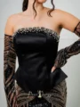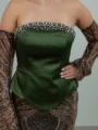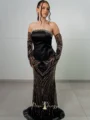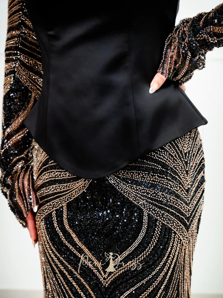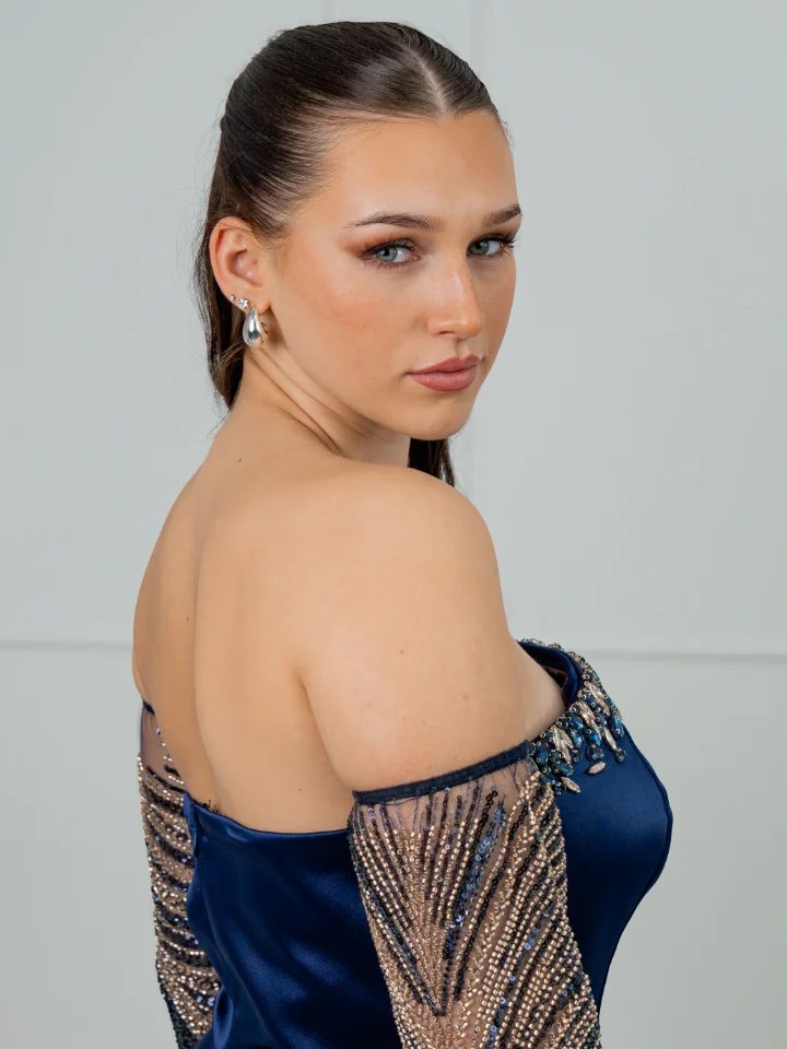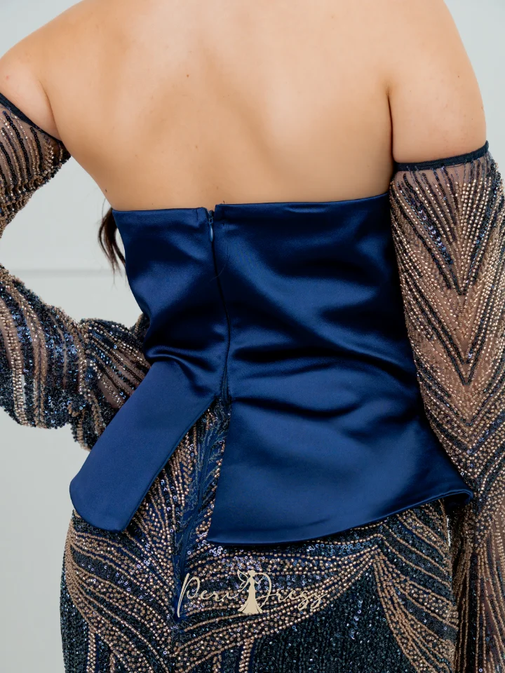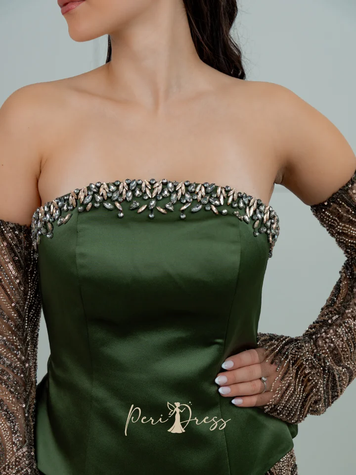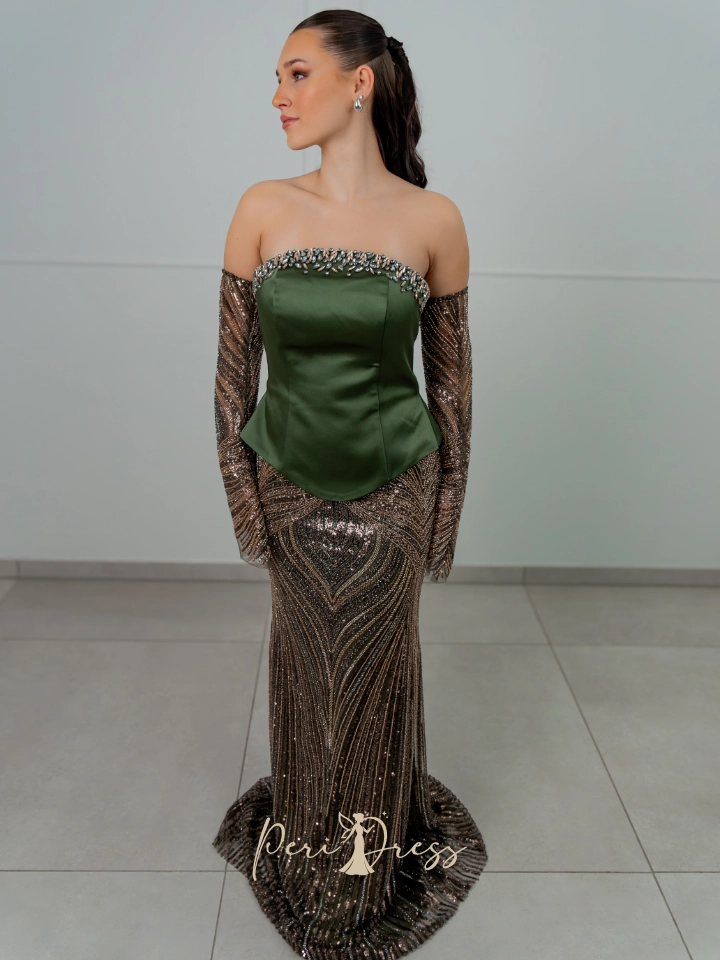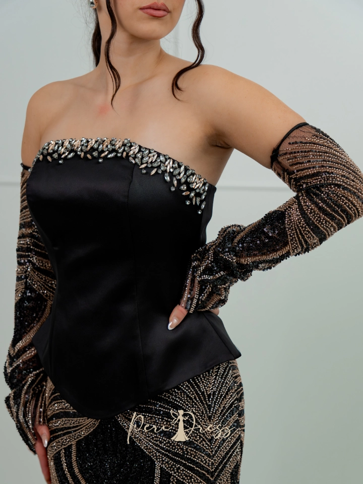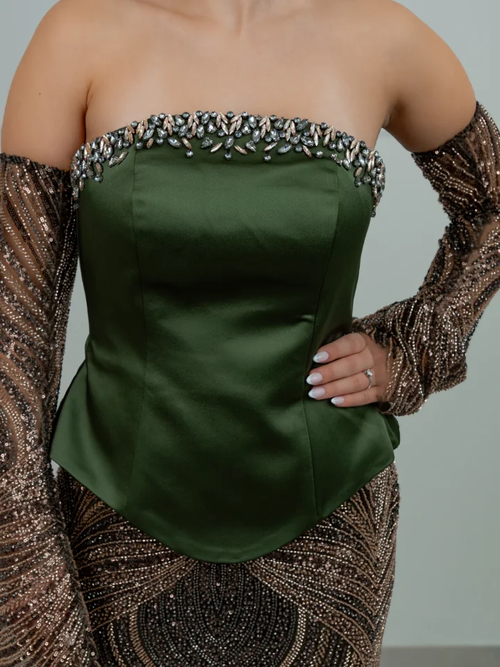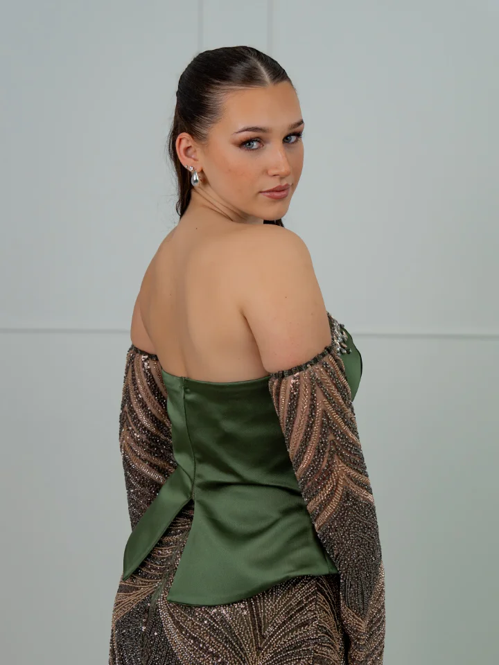 Das Eyla Dress in hellem Braun bezaubert durch seine raffinierte Zweiteiler-Optik. Das trägerlose Grundkleid wird durch ein separates Oberteil ergänzt, das vorne einen eleganten Spalt zwischen Stoff und Haut zeigt. Ton-in-Ton schimmernde Perlen und Pailletten verleihen dem Kleid Tiefe, während der Schlitz hinten subtile Sinnlichkeit betont.