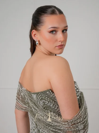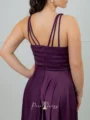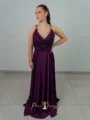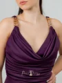 Das Sara Dress in dunklem Lila kombiniert luxuriösen Satin mit goldenen Details. Die Träger bestehen aus feinen Goldketten, die über die Schultern in satinierte Bänder übergehen. Der tiefe Wasserfallausschnitt und der fließende A-Linien-Rock mit Schlitz schaffen einen glamourösen, aber edlen Look. Ideal für elegante Abende und festliche Anlässe.